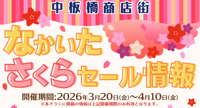 今年も石神井川の桜並木の開花に合わせて「なかいたさくらセール」を開催いたします。
